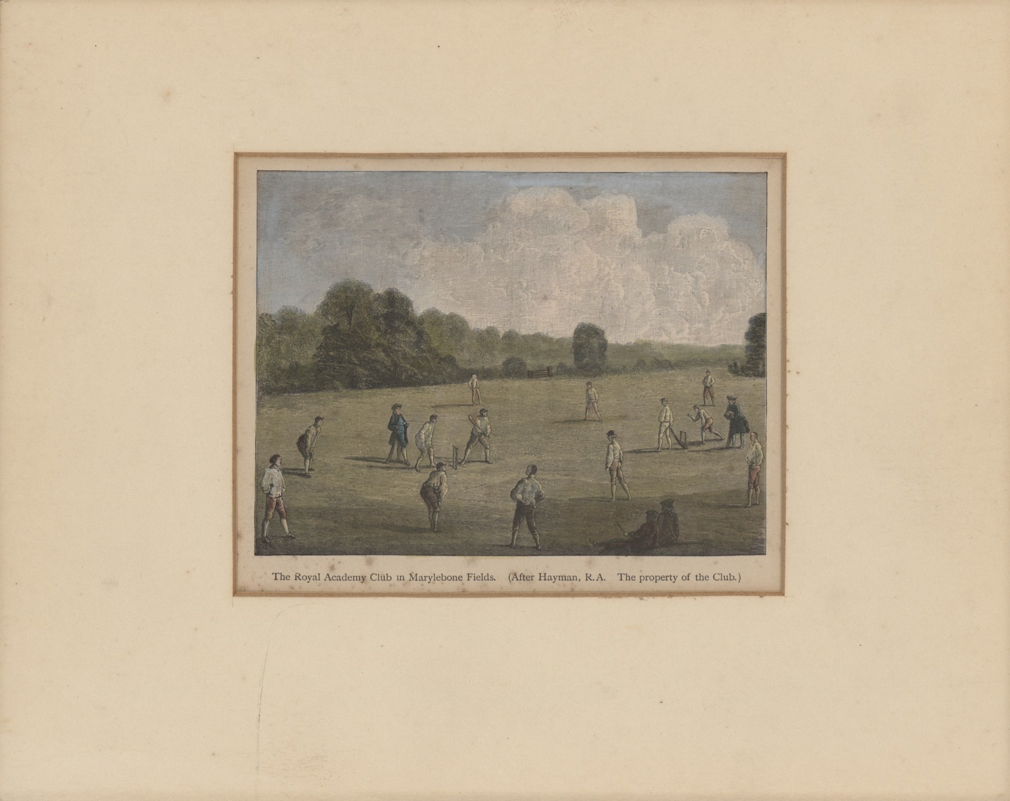 Nicely mounted hand-coloured bookplate reproducing the famous painting of 1748 by Francis Hayman in the MCC collection.