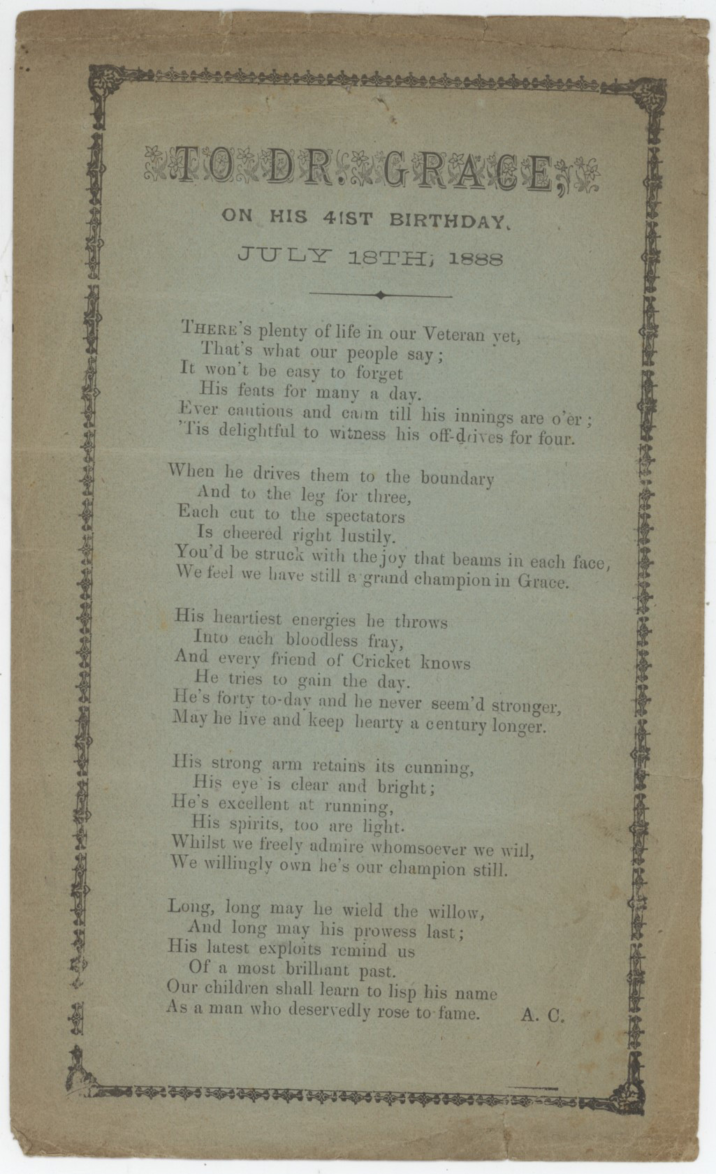 Original printed poem by A.C. (Albert Craig, the Surrey Poet) praising the cricketing feats of the great man - "His heartiest energies he throws into each bloodless fray". Formed of five stanzas of six lines each. Although titled "41st Birthday" it was actually Grace's 40th birthday - he was born on July 18th, 1848.