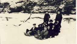 Real Photograph. No printed title, only clues is hand-written legend to verso: "Some class of the toboganning party, this was some of the House Boys and a few of Hannah's friends". No publisher or date given. Postally unused. VG.