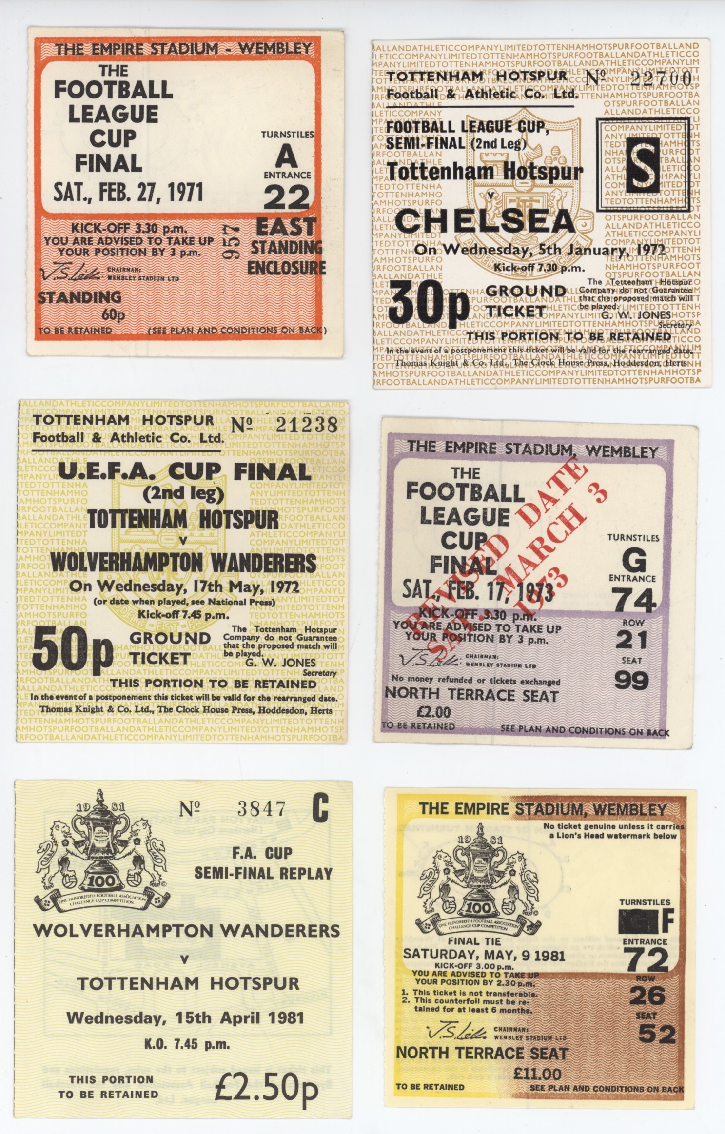 A group of 12 tickets for cup semi-finals and finals featuring Tottenham Hotspur from 1971 to 1982. Includes League Cup Final 1971, League Cup semi-final 1972, UEFA Cup final 1972, League Cup final 1973, FA Cup semi-final 1981, FA Cup final 1981, Replay 1981, Charity Shield 1981, League Cup final 1982, FA Cup final 1982, Replay 1982 and Charity Shield 1982.