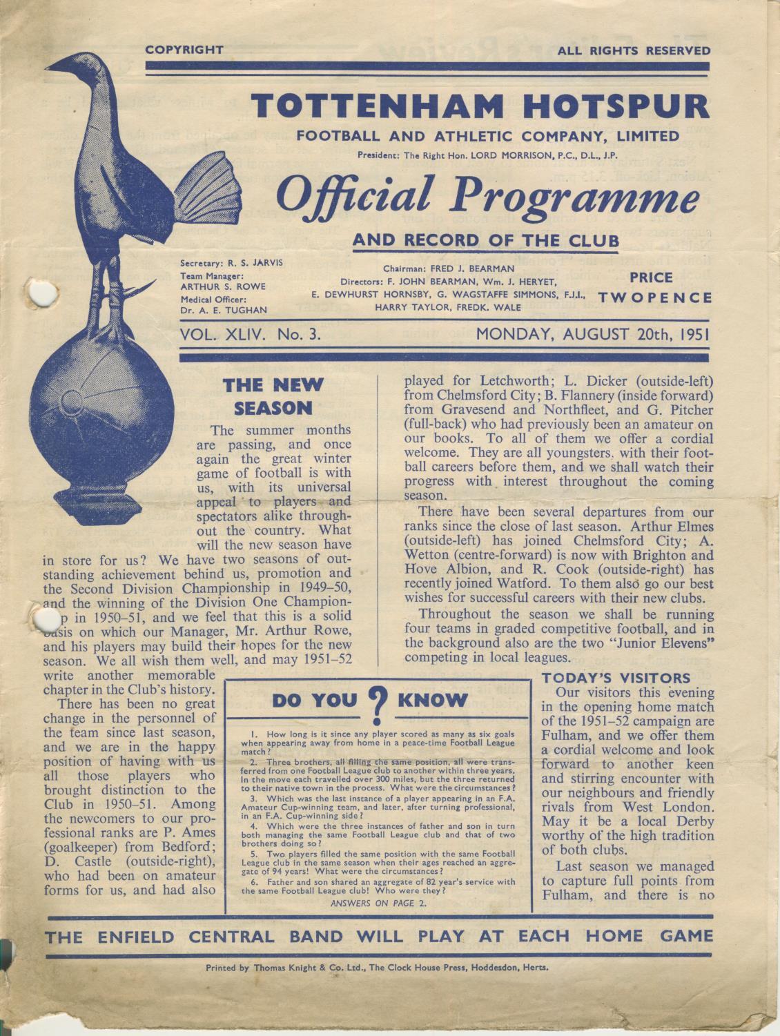 Official football match programme for the game played at White Hart Lane on August 20th, 1951.