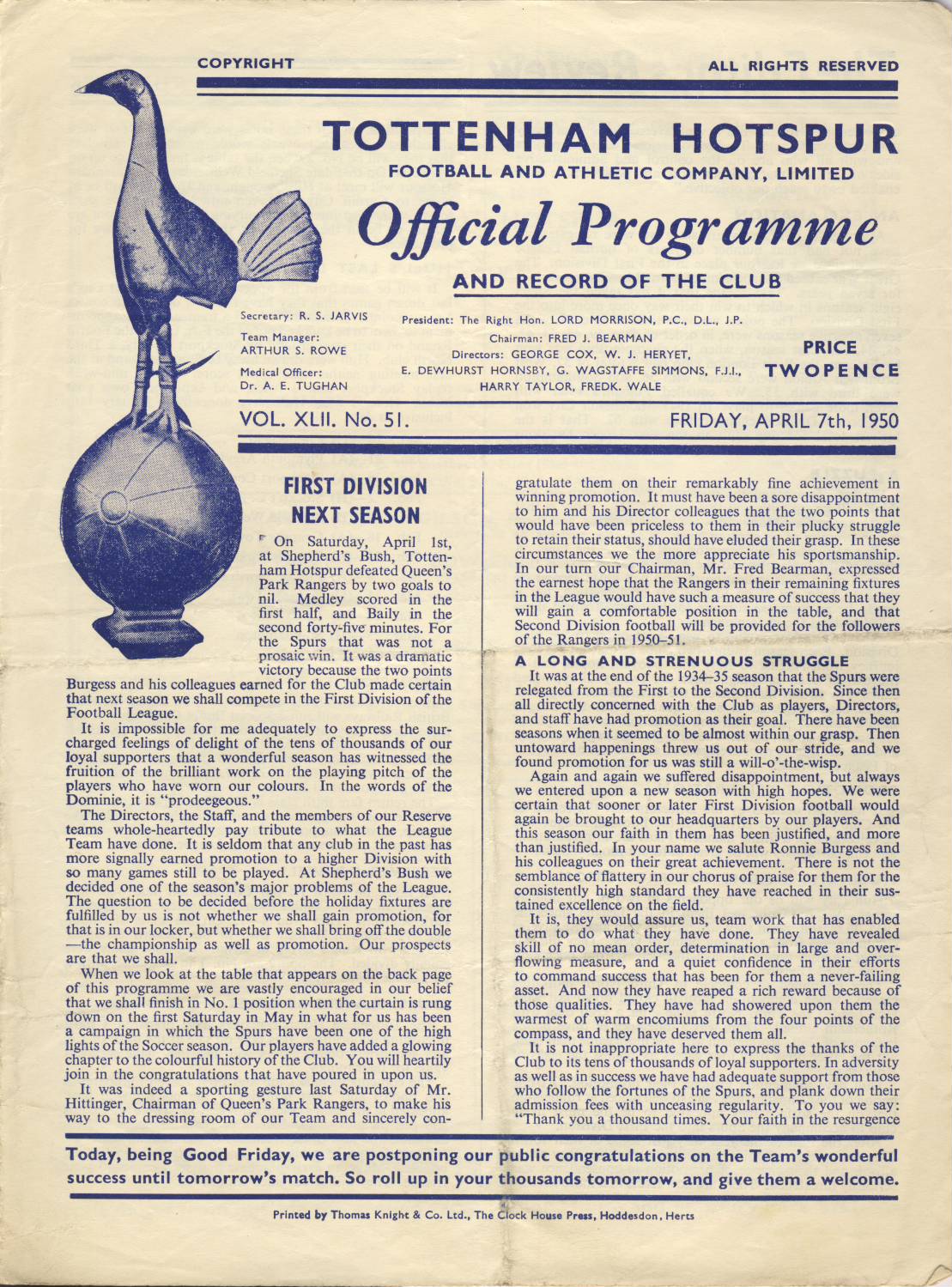 Original football match programme from the game played at White Hart Lane on the 7th of April 1950. Includes a short report on the match the previous Saturday when Spurs beat QPR to seal promotion back to the First Division.