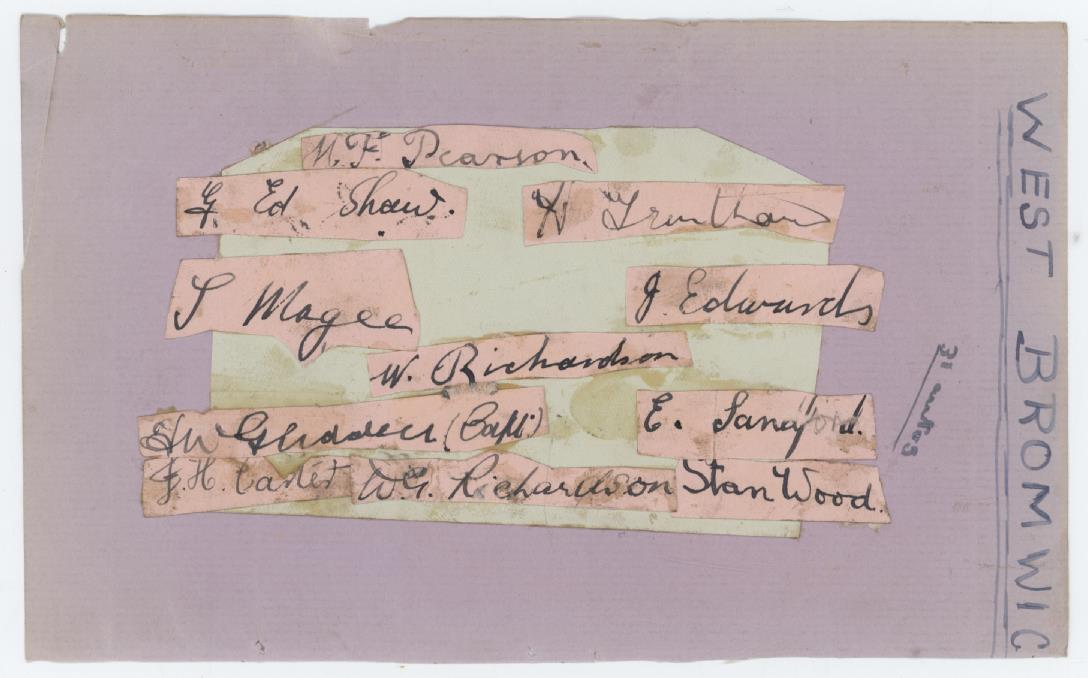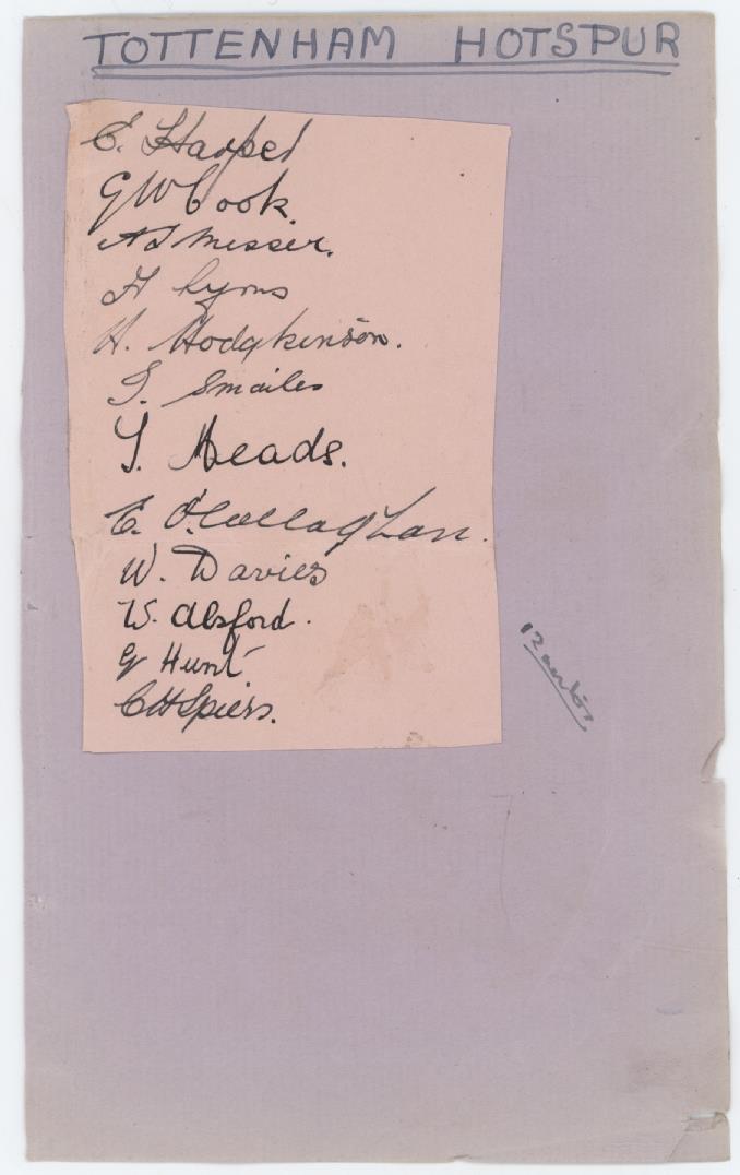 Album page with a smaller sheet laid down. This signed in ink by 12 Spurs players from 1930-31, including Harper, Cook, Messer, Lyons, Hodgkinson, Smailes, Meads, O'Callaghan, Davies, Alsford, Hunt and Spiers. Signed to the reverse by 11 West Brom players from the same season, these individually cut and laid down with glue. They include Pearson, Shaw, Trentham, Magee, Edwards, Richardson, Glidden, Sandford, Carter, Richardson and Wood.
