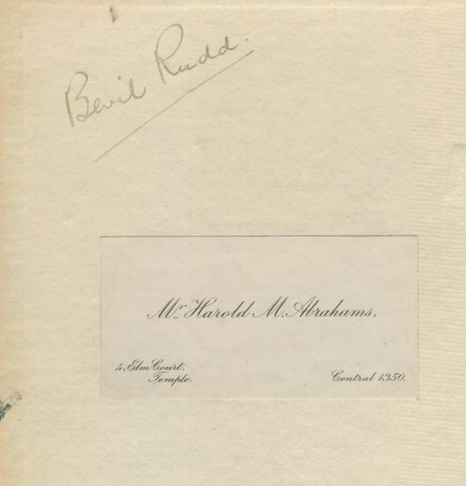 First edition. 8vo. 189pp. Original blue cloth boards, lightly rubbed and spine a little faded. Harold Abrahams' personal business card is laid down neatly to front pastedown. To the same page is the ownership signature of Bevil Rudd, who won three medals for South Africa, including gold in the 400m, at the 1920 Olympic Games. A very rare book with excellent provenance.