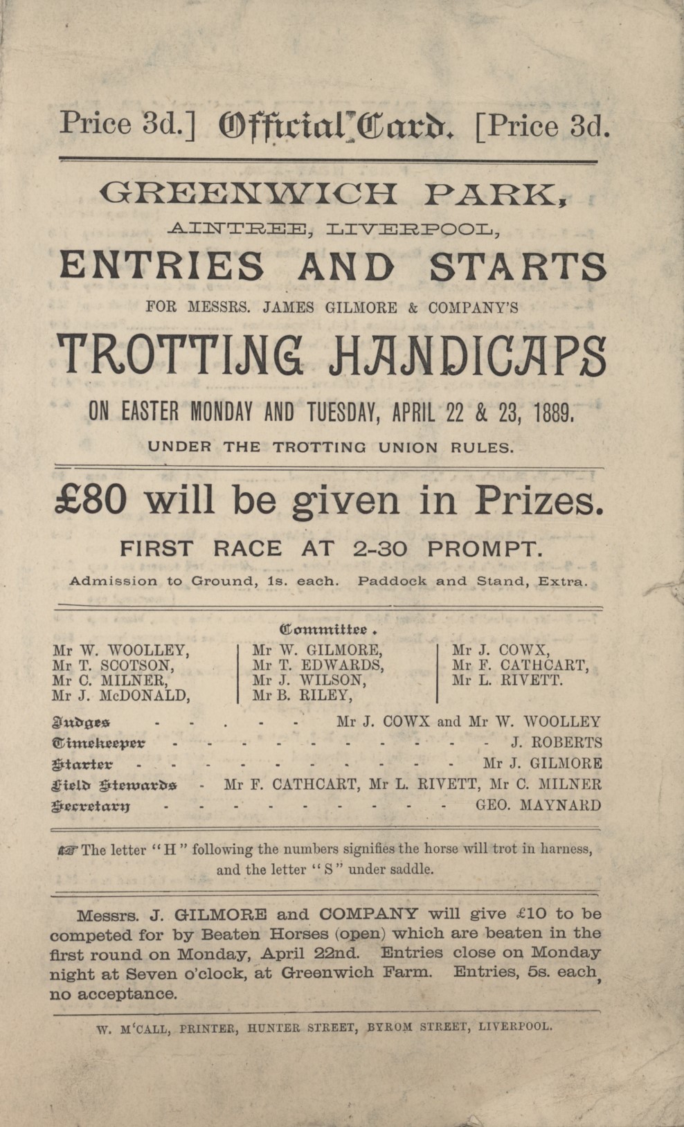 Other Sports » Horse Racing » Memorabilia » Racecards » TROTTING RACES 1889 (GREENWICH PARK, AINTREE) OFFICIAL CARD