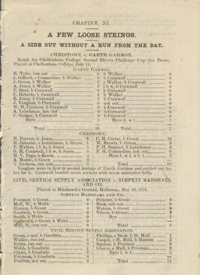 In 1878 two cricket teams, within two months of each other, managed to complete their innings without any runs being scored from the bat. On May 18th 1878 Simpkin Marshall & Co. scored a total of 1 (courtesy of a bye) at Holloway against Civil Service Supply Association - and then, on July 11th in a Cheltenham College 2nd XI match, Garth Gammon totalled 7 in their second innings (6 byes and 1 wide) against Christowe. In this match the bowler Cornwall took 7 wickets with successive balls and the opener, Vaughan, carried his bat for 0*. This is an original page taken from the 1878 James Lillywhite's Cricketers' Annual - no great value in itself, but certainly a very amusing and interesting display item.