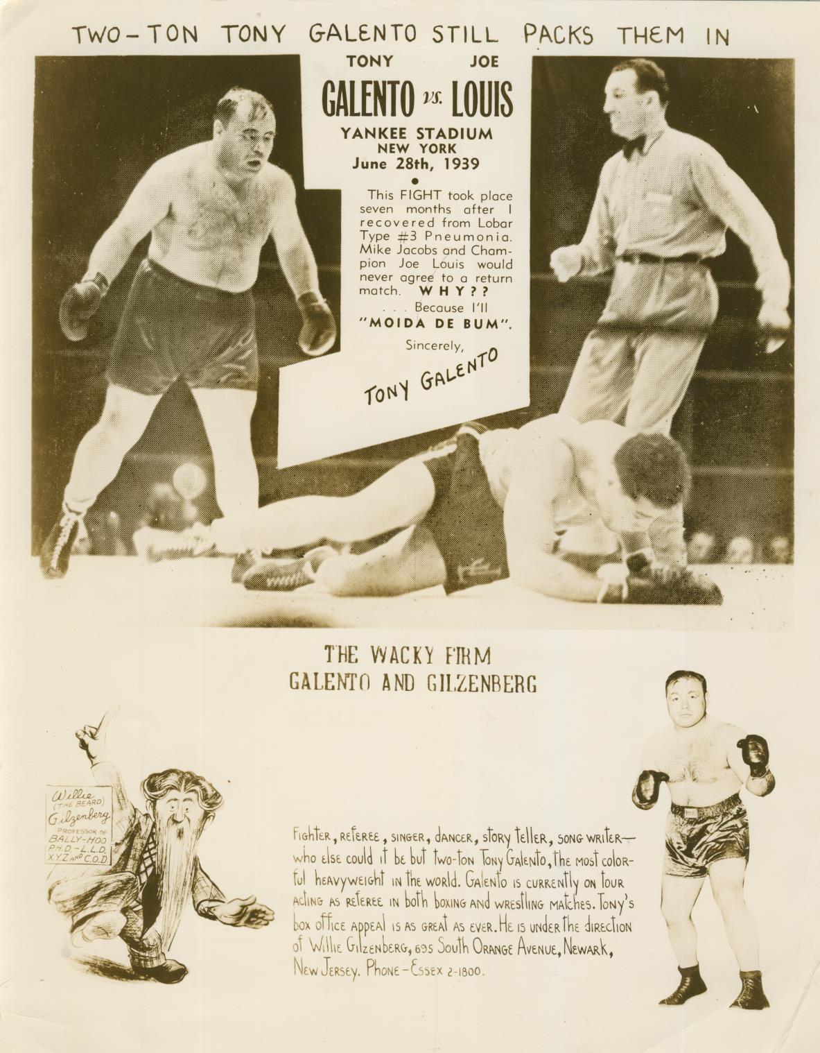 Original publicity photograph proclaiming the talents of Two-Ton Tony Galento, the American heavyweight who promised to 'moida de bum' when pitted against Joe Louis in 1939. Galento did indeed floor Louis in the third round before being defeated. The photo offers his services as fighter, referee, singer, dancer, story teller and song writer.