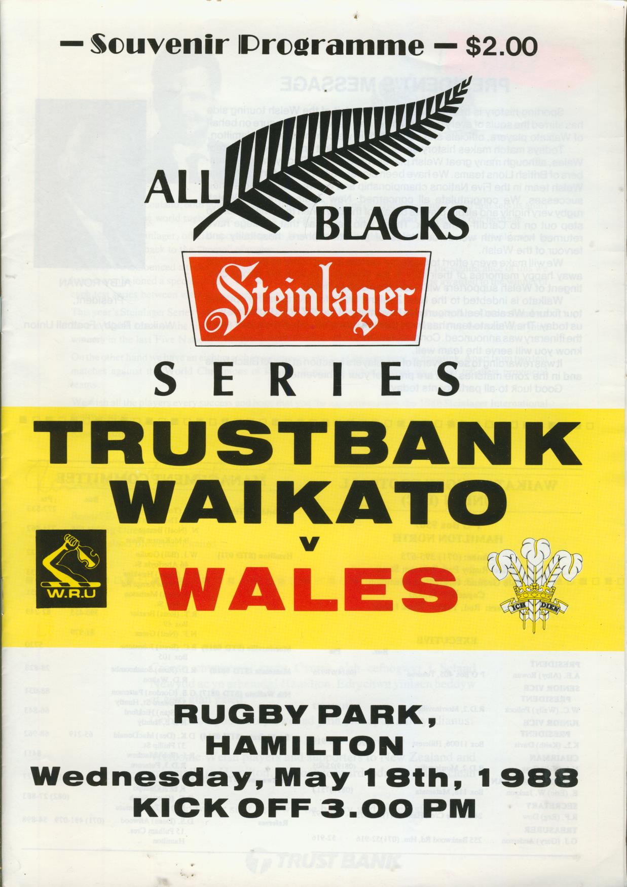 WAIKATO V WALES 1988 RUGBY PROGRAMME
