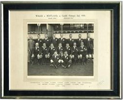 Original black and white photograph, by J.E.Thomas, Newport, of the Welsh team that defeated Scotland at Cardiff on February 2 1935. Players' names inscribed on mount.