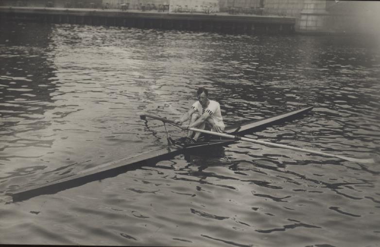 Original postcard from the 1912 Stockholm Olympics, showing the Scottish sculler Wally Kinnear, who won the gold medal in the single sculls. Published by Brefkort.