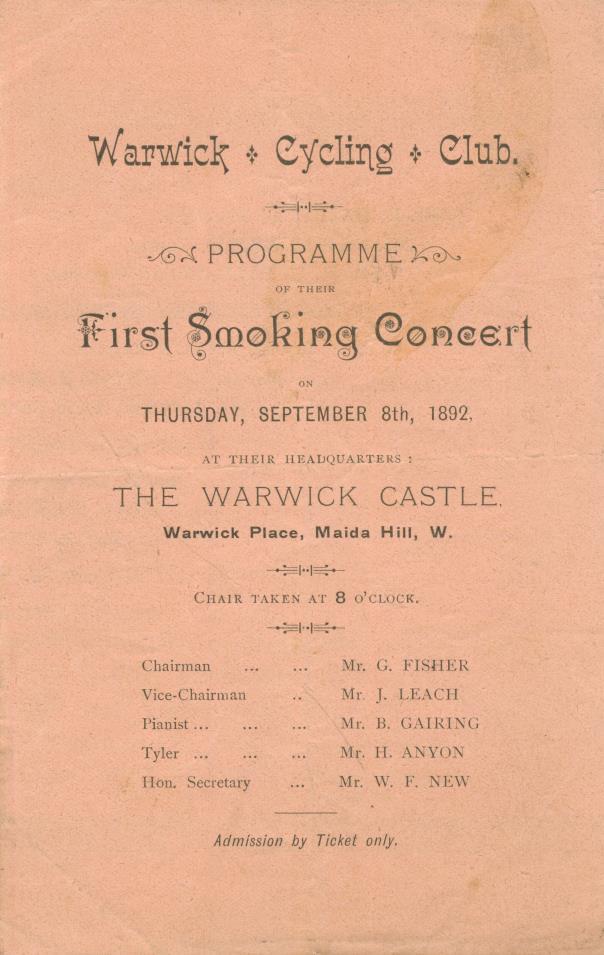 Original programme for the First Smoking Concert held by the Warwick Cycling Club at The Warwick Castle, Maida Vale, on September 8th, 1892. This was an evening of live music and comedy put on for, and often by, the members of the club. Cycling Clubs, such as this, were very popular in the late 19th century.