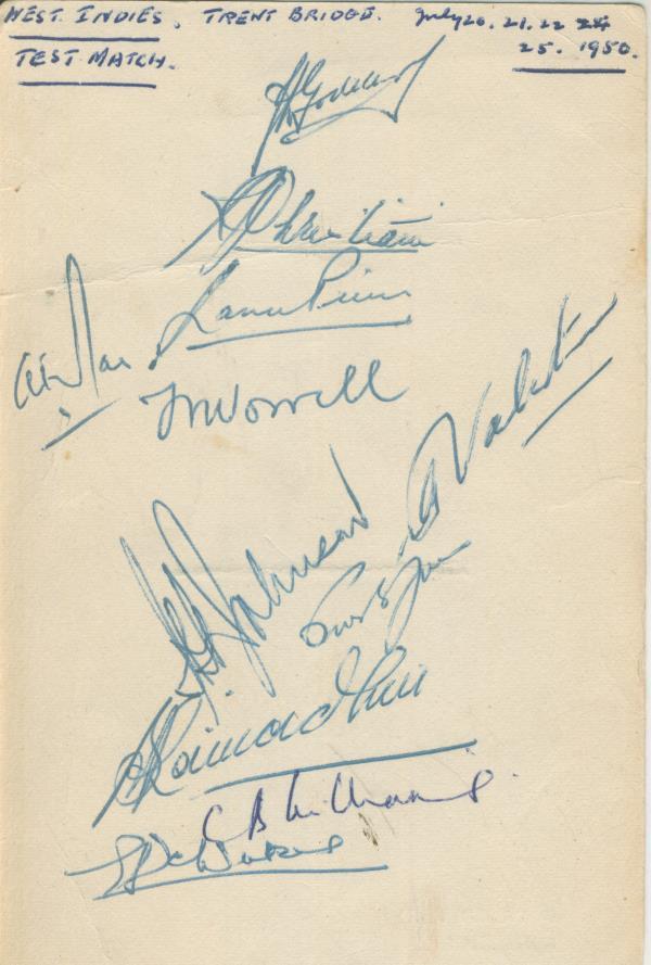 Menu card, signed on the back in ink by 11 West Indian cricketers, most of whom were in the team that won the third Test match at Trent Bridge, July 20-25, 1950. The autographs are Weekes, Johnson, Ramadhin, Valentine, Williams, Worrell, Pierre, Jones, Christiani, Rae and Goddard. Worrell scored his famous match-winning 261 in the first innings. The menu was for dinner at the Black Boy Hotel, Nottingham, on July 20th 1950 (the opening day of the Test match).