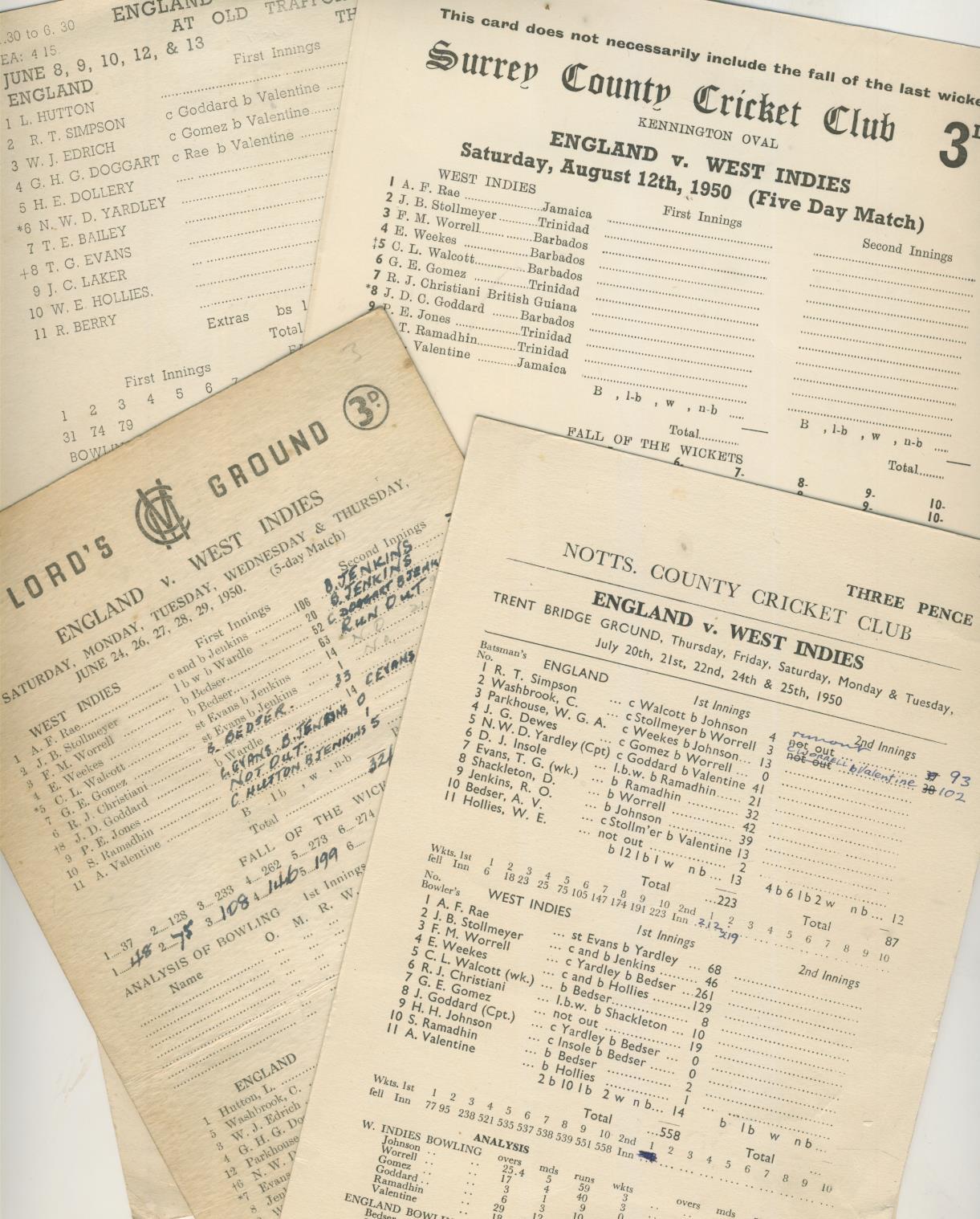 WEST INDIES 1950 CRICKET SCORECARDS - INCLUDING ALL 4 TESTS