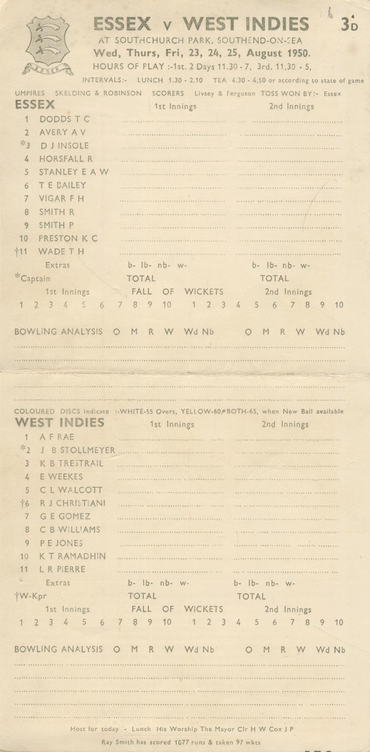 ESSEX V WEST INDIES 1950 CRICKET SCORECARD