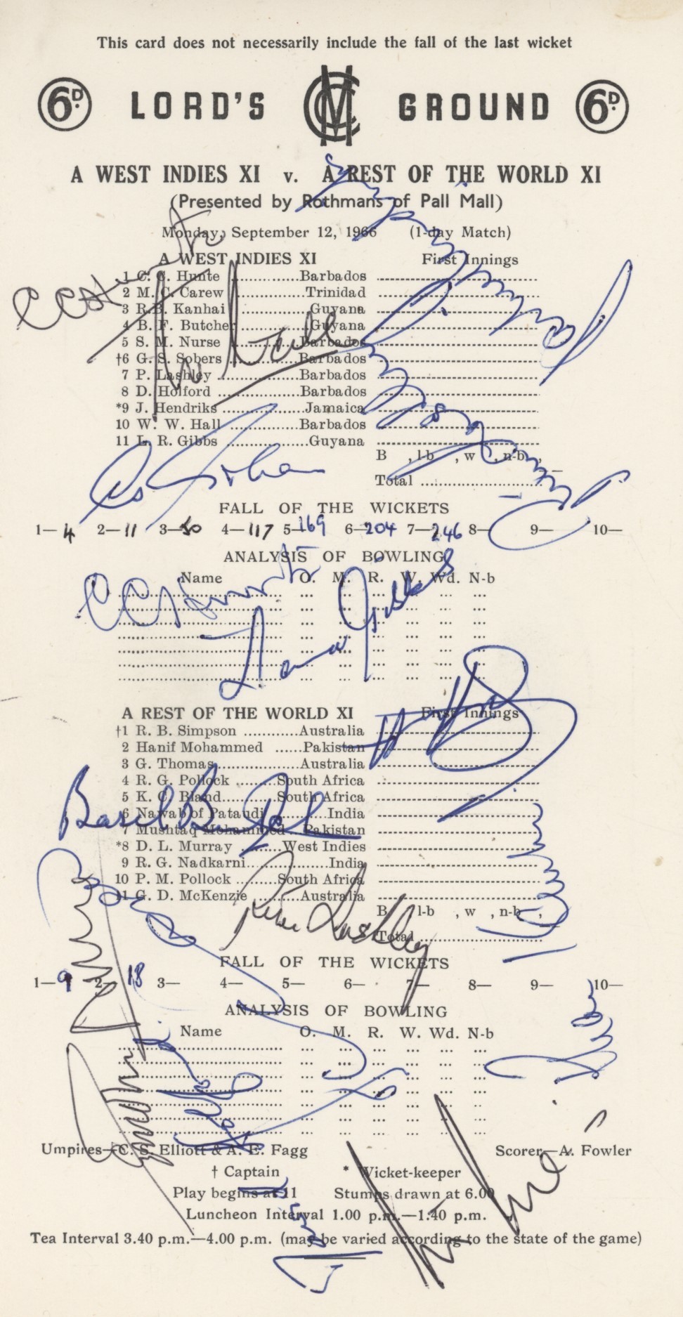 Cricket » Cricket Scorecards » Representative Teams » WEST INDIES XI V REST OF WORLD XI 1966 CRICKET SCORECARD - SIGNED BY WEST INDIES