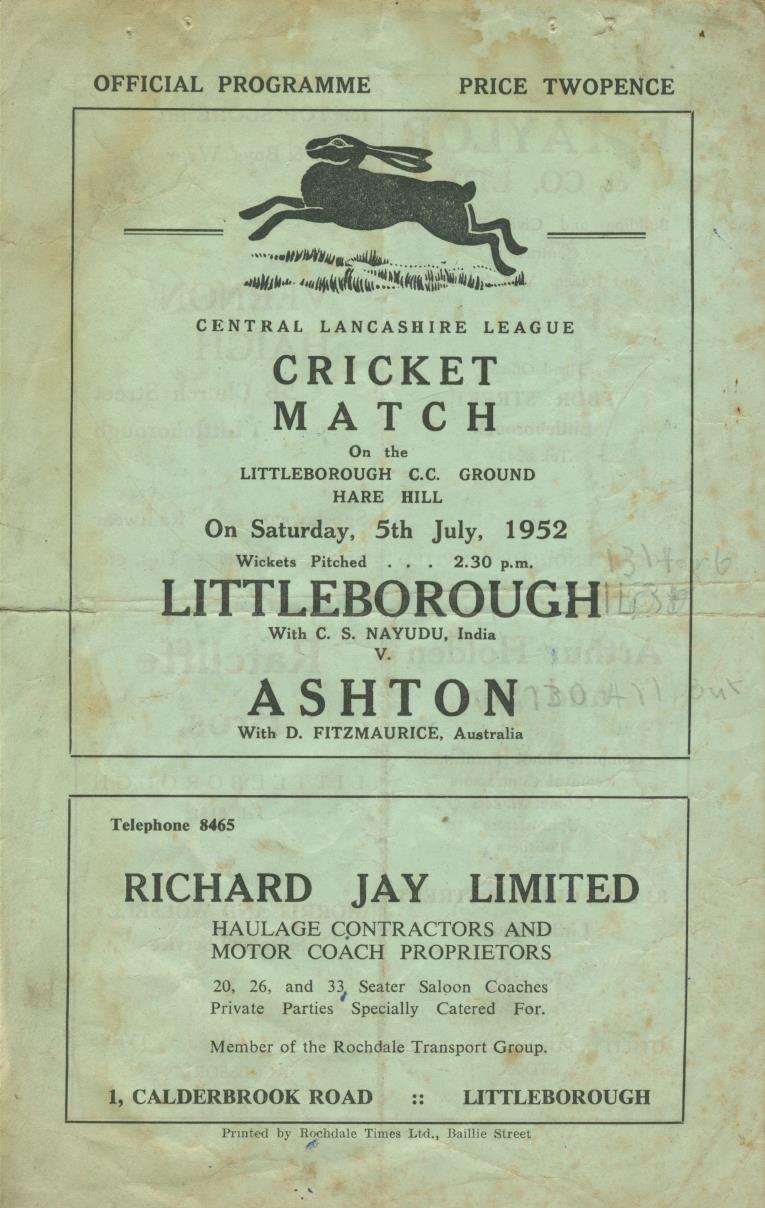 Cricket scorecard for the Lancashire League match played at Littleborough on July 5th, 1952. C.S. Nayudu, the Indian cricketer, was the professional for Littleborough, and Des Fitzmaurice, the Australian, was Ashton's professional. Nayudu came out on top, taking 6 wickets and then scoring 38. Foxed and creased with scores recorded in ink. Fair/good condition.