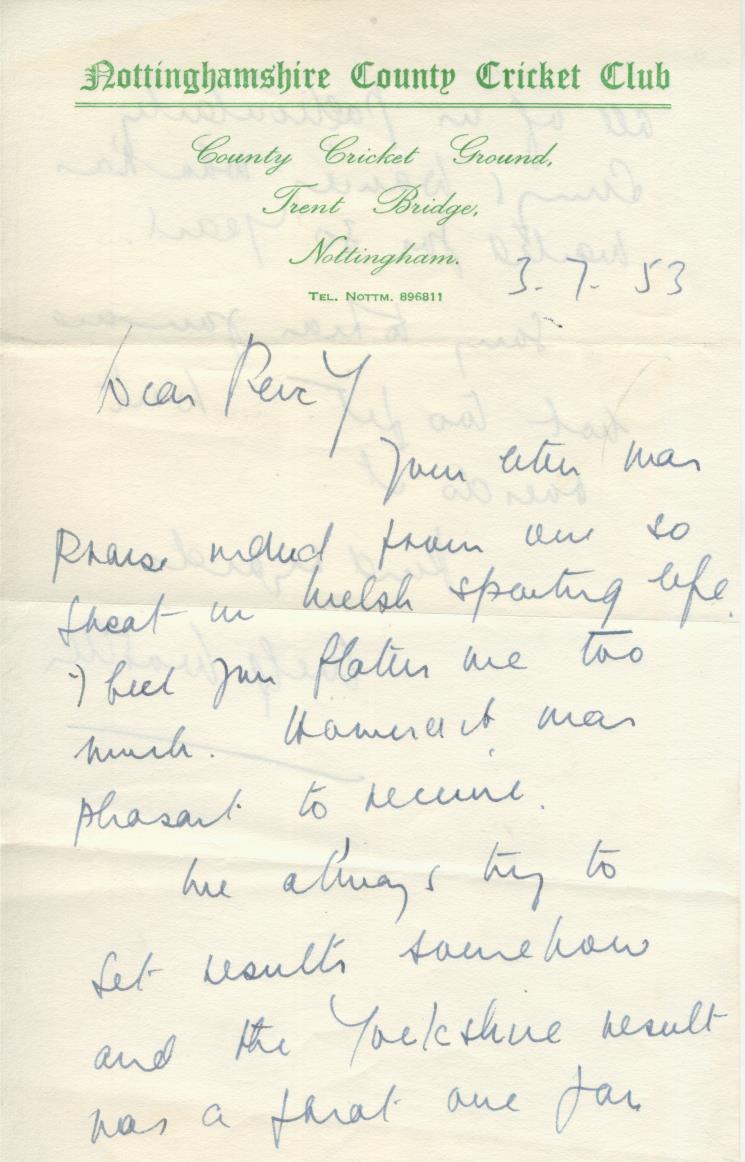 Manuscript letter, nicely signed, from Wilf Wooller, the legendary Welsh rugby player and cricketer to a Welsh legend of a previous era, the great Percy Bush, who starred for Wales and the British Lions between 1904-1910. Comes with the original handwritten envelope.