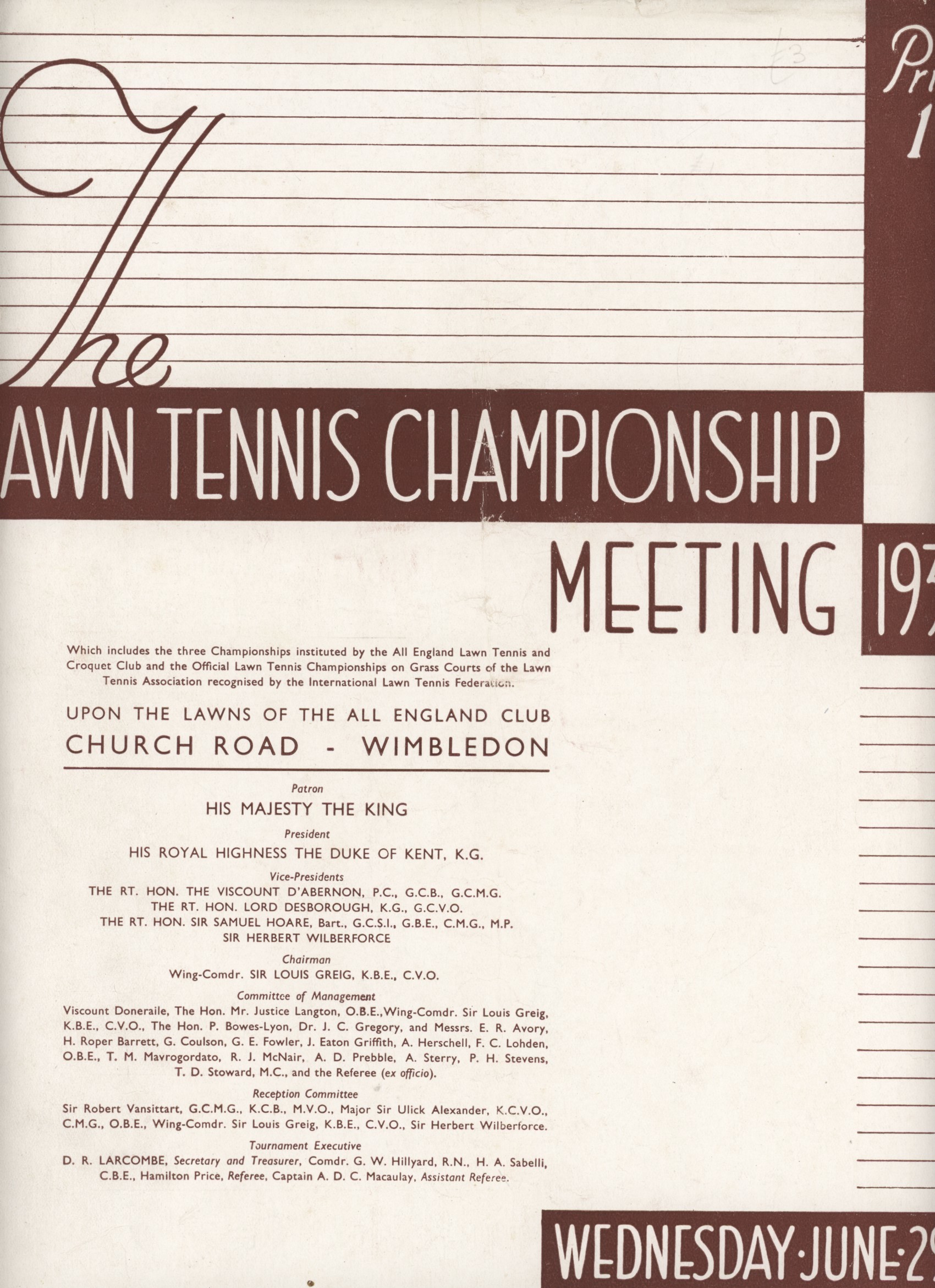 WIMBLEDON CHAMPIONSHIPS 1938 TENNIS PROGRAMME