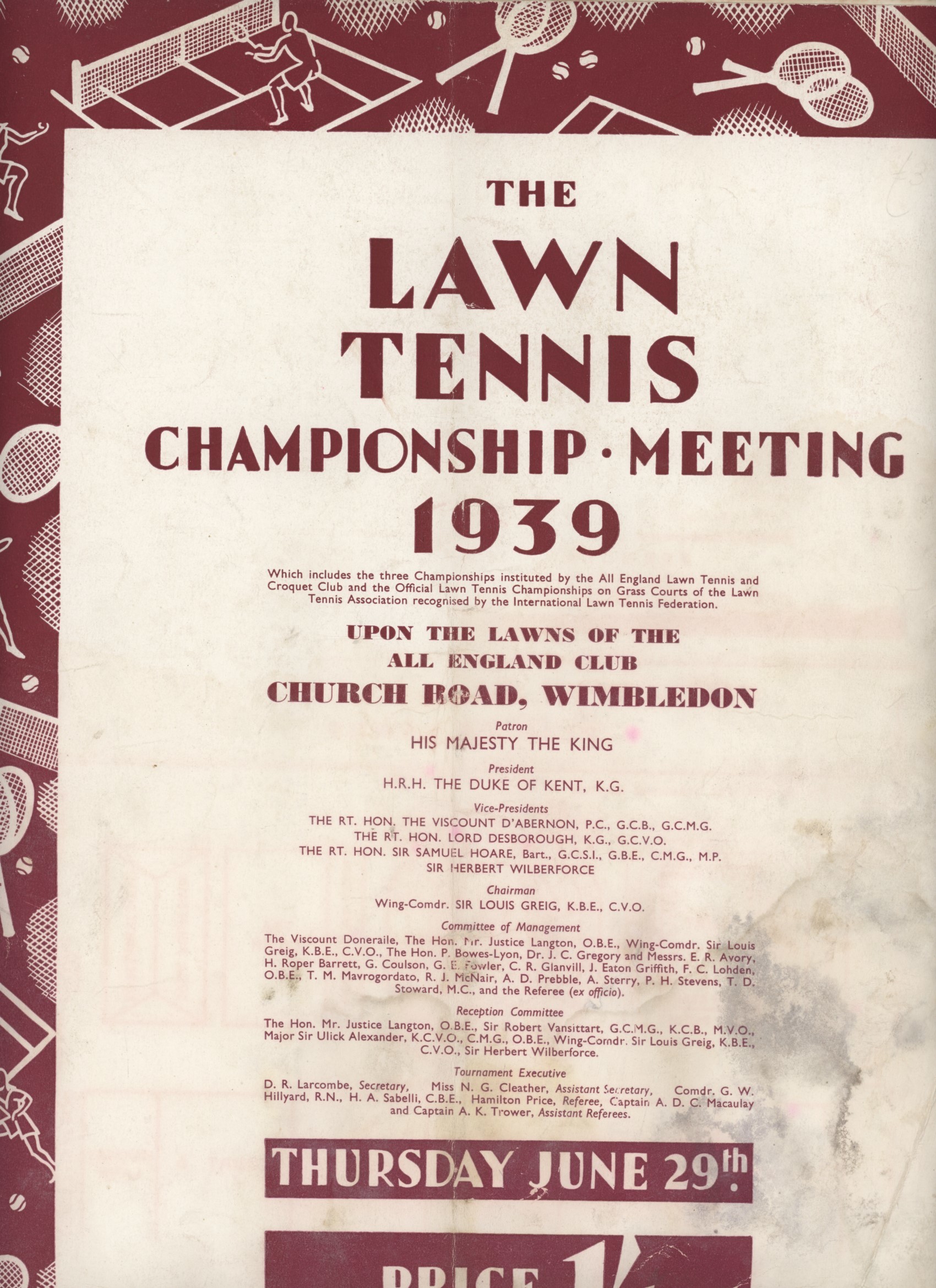 Official daily programme for Thursday June 29th, the last year of the event before the onset of World War Two. Bobby Riggs won the Men's Singles, Alice Marble the Women's