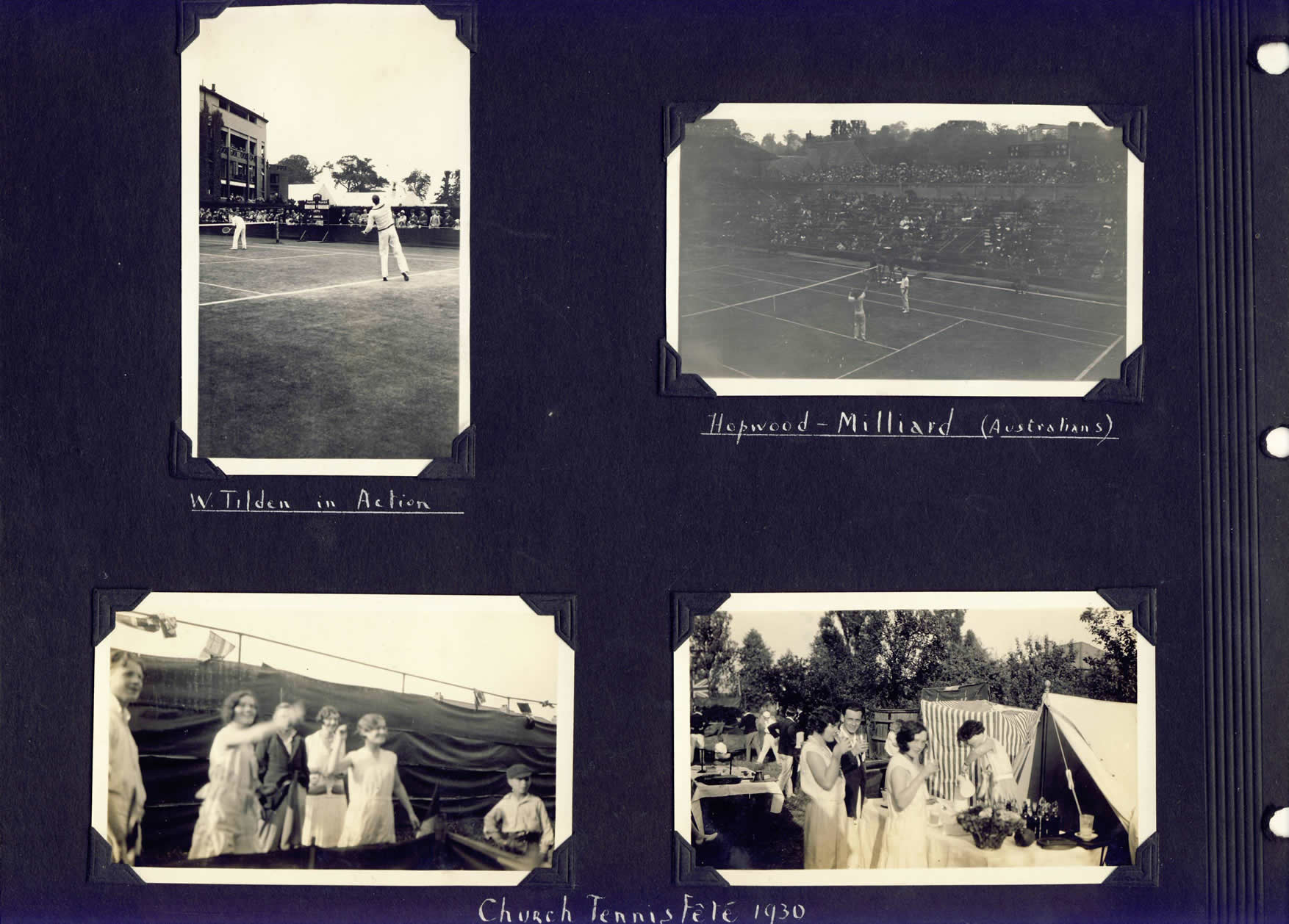 A group of six black and white tennis snapshots, taken during the 1930 Wimbledon Championships. They are all action photographs and show Elizabeth "Bunny" Ryan serving (Singles Finalist), Josane Sigart serving, two photos of Ryan and Helen Wills Moody (Doubles Champions - they also contested the singles final), Bill Tilden serving (Singles Champion) and the Australian doubles pair - Harry Hopman and Jim Willard. Also included are two photographs from a Church Tennis Fete.
