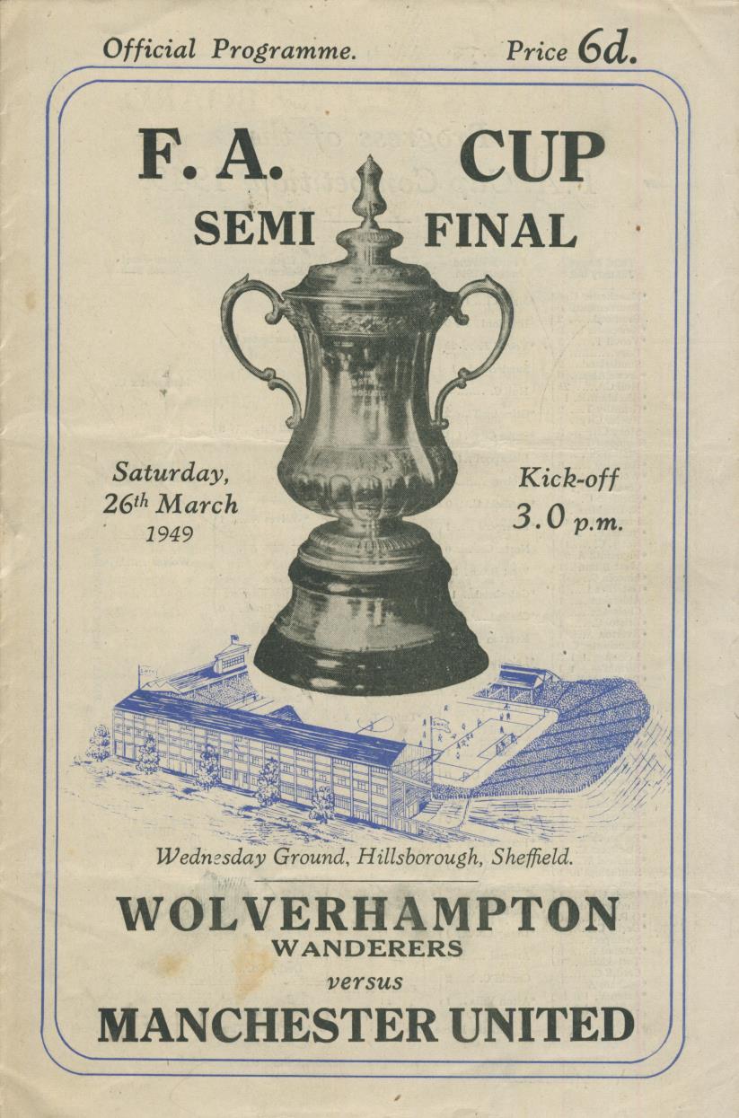Official programme for the 1949 FA Cup semi-final between Wolves and Man United at Hillsborough. The match was drawn 1-1, with Wolves winning the replay and then defeating Leicester City in the final.