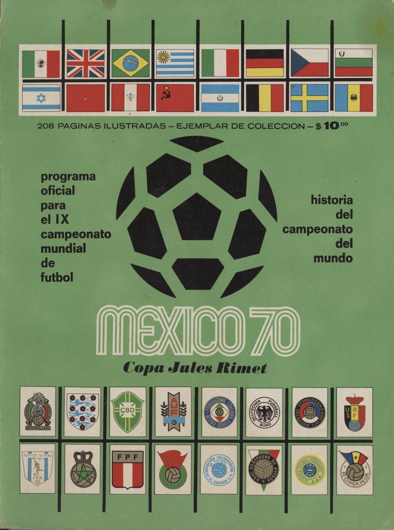 Green-covered version of the official 1970 World Cup souvenir programme, with profiles of competing nations and a guide to the sites and stadiums. Text in Spanish.