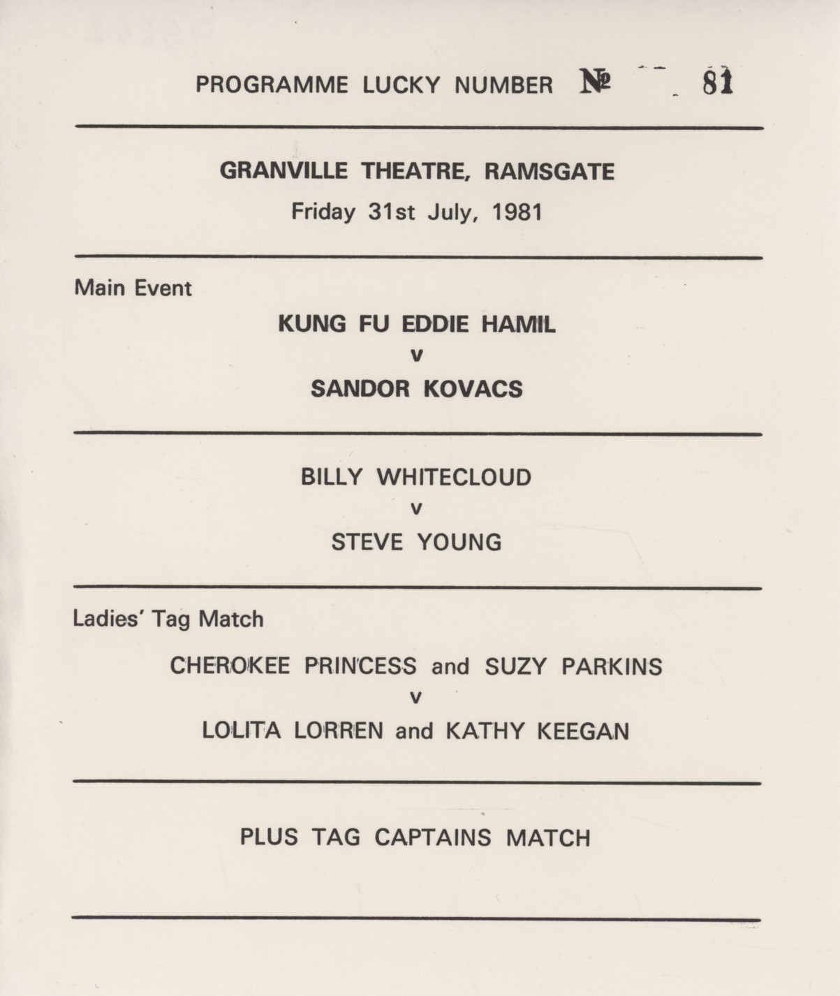 Original flyer for an evening of wrestling held at the Granville Theatre, Ramsgate, on July 31st, 1981.