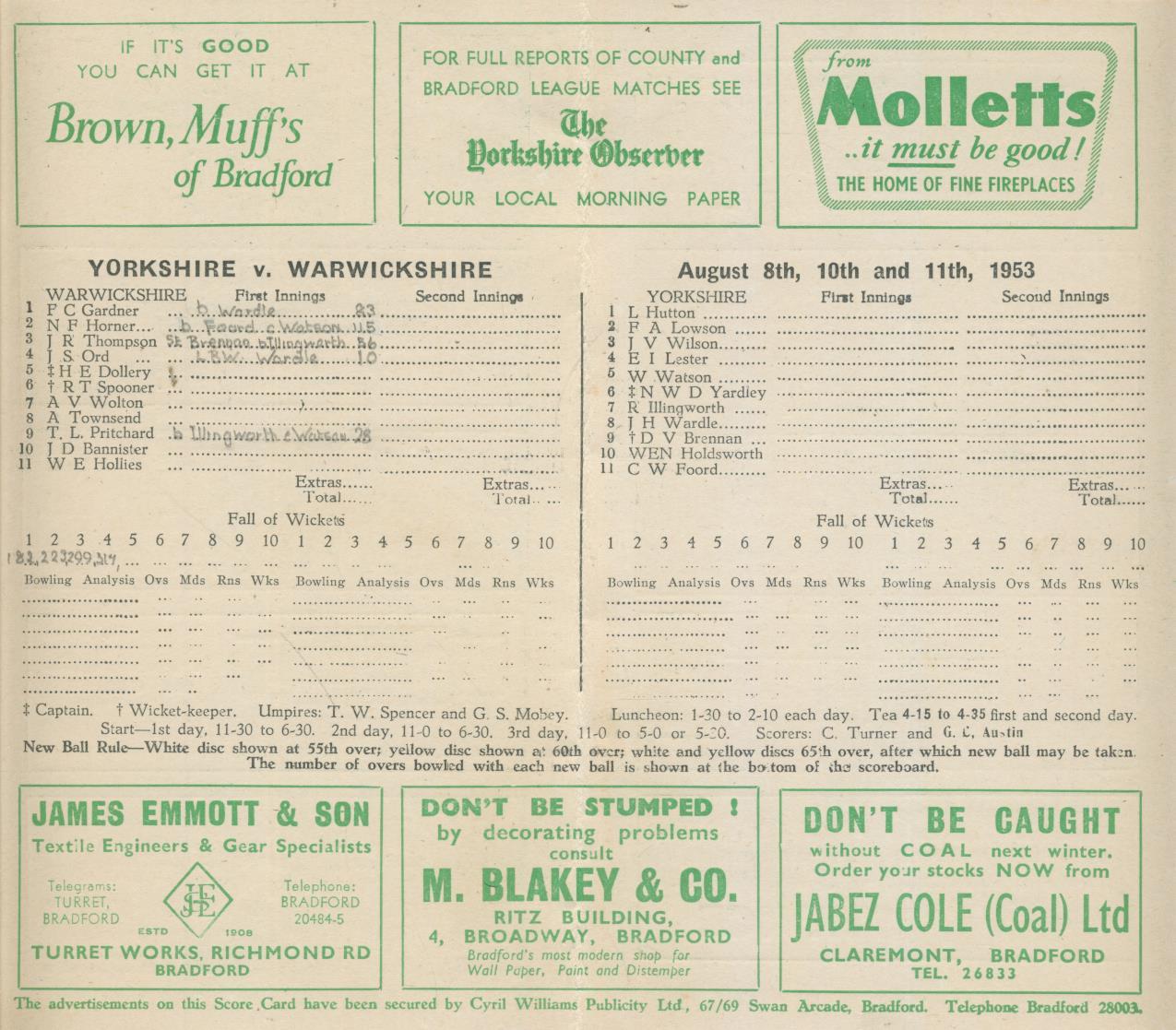 Cricket » Cricket Scorecards » Yorkshire » YORKSHIRE V WARWICKSHIRE 1953 CRICKET SCORECARD