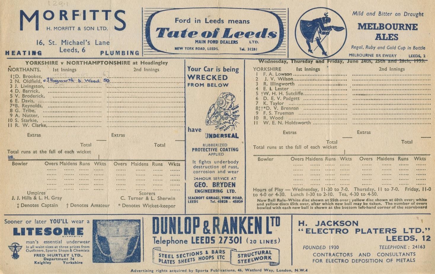 Cricket » Cricket Scorecards » Yorkshire » YORKSHIRE V NORTHAMPTONSHIRE 1953 CRICKET SCORECARD